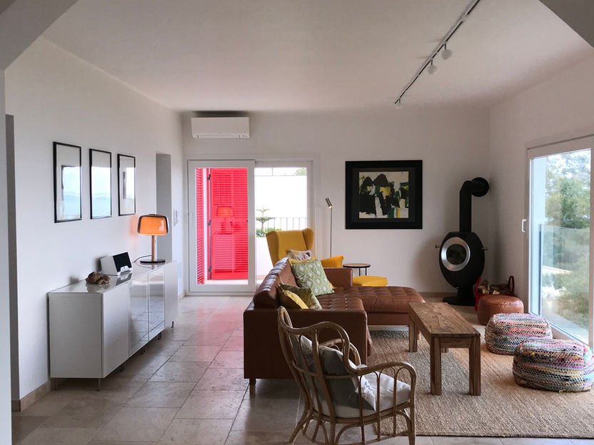 Meerblick von allen Zimmern, ruhige Wohnlage, moderne hochwertige Ausstattung, Natursteinböden-/fliesen, top-moderne Einbauküche, neue Travertin-Natursteinbäder, vollklimatisiert, Fußbodenheizung, Kaminofen, Waschmaschine, Trockner, kostenlose Parkmöglichkeit in unmittelbarer Nähe.